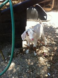 We discovered the favorite hiding places for the baby goats were in the many brush piles we have on the property. The kids would go deep into the piles where they could not be seen and they did not tend to cry out for help. We would stand outside the piles calling, “here baby goatie, come on out”. After a few minutes we would hear a tiny whimper and then the kids would very cautiously come out of the pile to us.